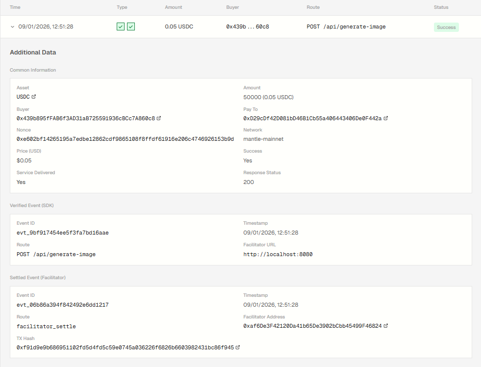 After user approval, it transfers USDC, automatically pays the gas fee through the Mantle network, and generates a payment header.